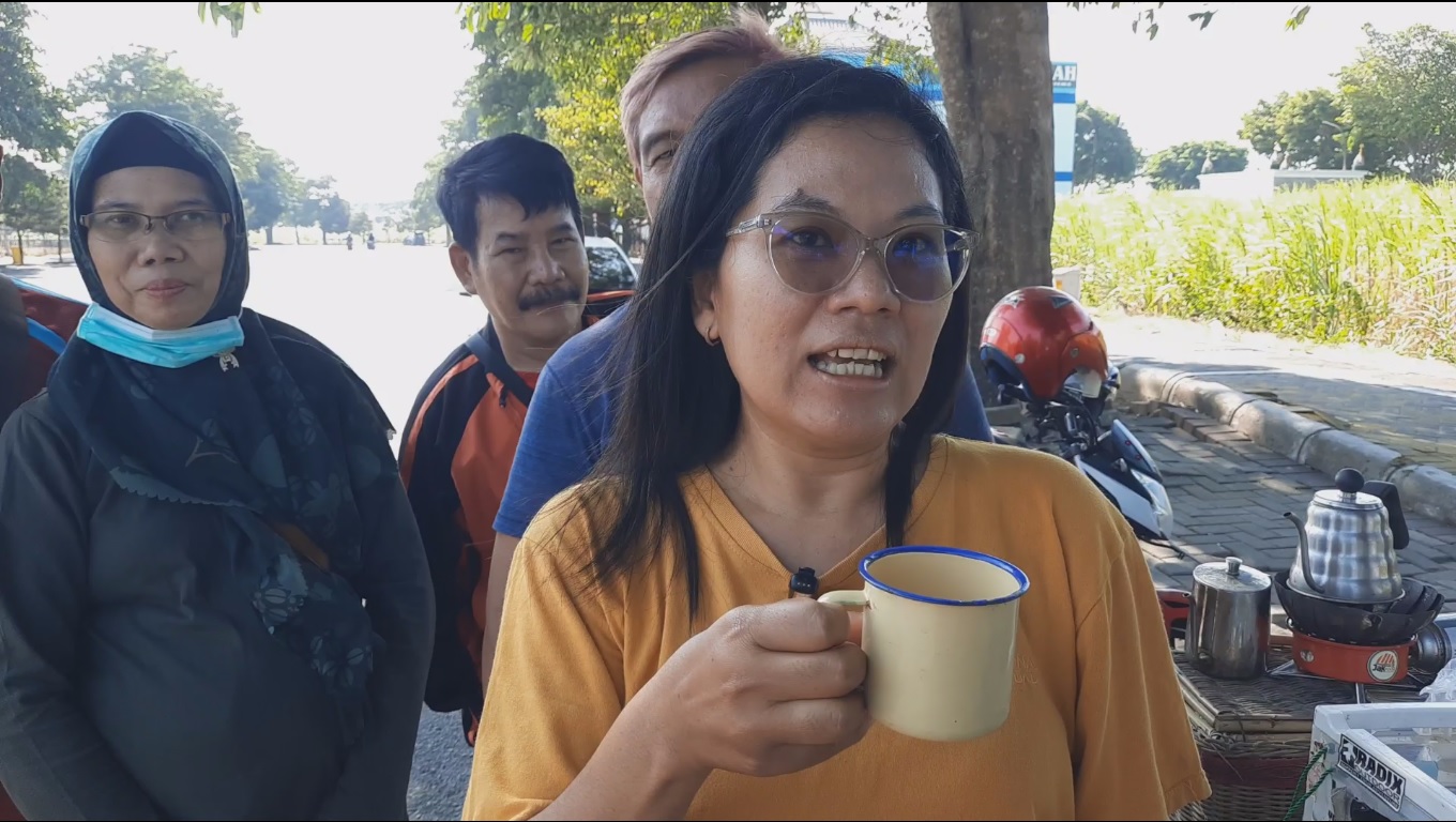 Ical Penjual Kopi (Tengah) Sedang Melayani Pembeli Saat Stay Di Area SLG Kediri (Foto: Beny Kurniawan)